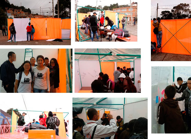 En el 2015 los ejercicios de Diseño Básico Común se alimentaron de los aportes del taller de origami6 aprendiendo a pensar y elaborar sistemas originales de enganche y conexiones entre partes, a partir de la experiencia de doblar el papel. Se llegó al diseño y realización con materiales económicos de una estructura modular, realizada en el barrio Pardo Rubio para un evento participativo denominado “Pille el cubo”7 del cual los estudiante idearon y realizaron la imágen gráfica (logo y afiche), la comunicación y la publicidad. La estructura “habitable”, un cubo de 6x6 mt. acogió otros estudiantes de primaria del Colegio San Martín de Porres y permitió exponer los resultados del curso de sensibilización cultural, con una instalación y material audiovisual y sonoro. Los elaborados de la asignatura de Sensibilización Cultural incluyeron, además de ejercicios de digital storytelling, un ejercicio exploratorio de arte sonoro, con trabajo de campo y registro en el barrio Pardo Rubio, que generó la producción de piezas de música concreta e instalaciones artísticas.